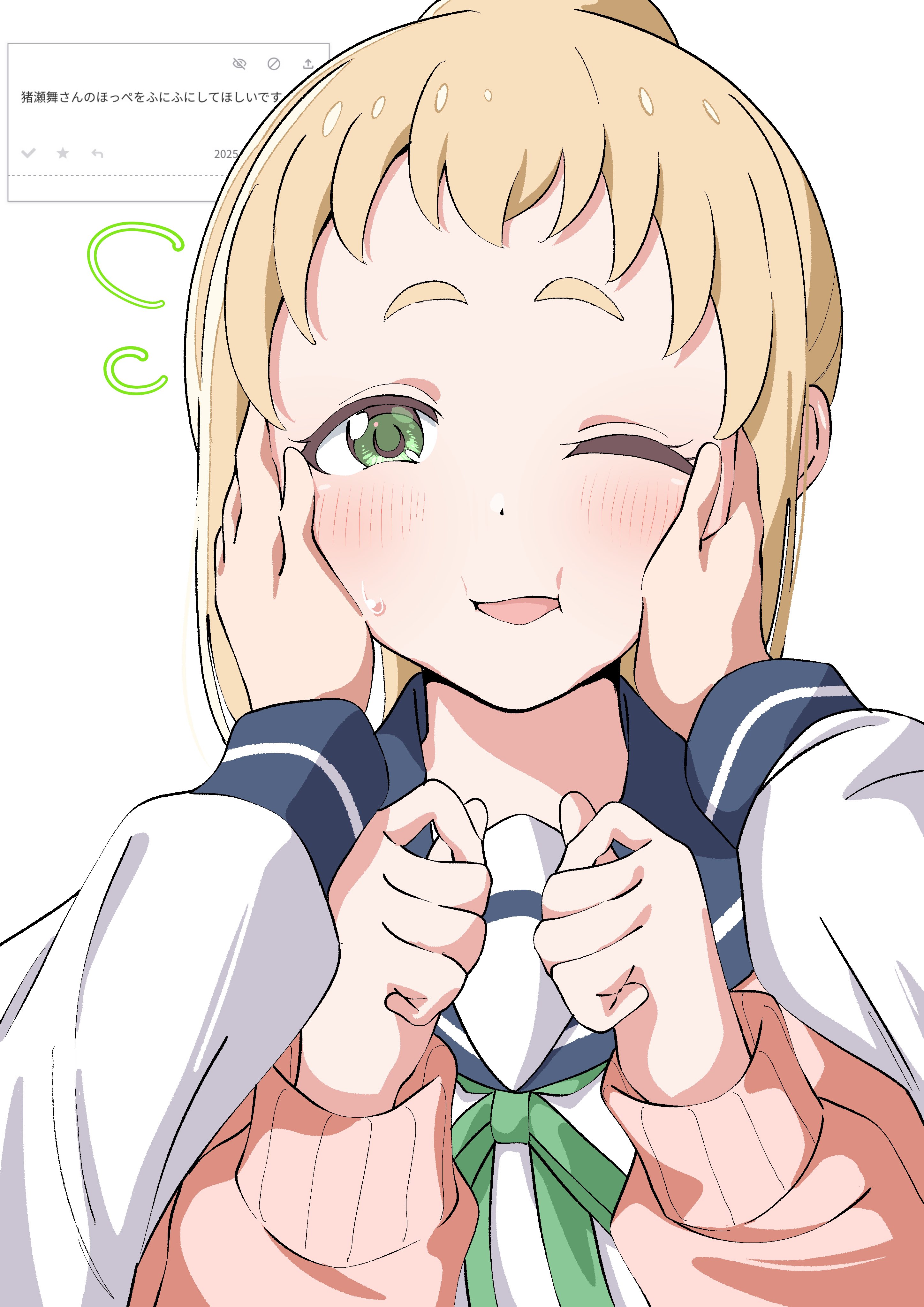 1girl1other2025blonde hairblue sailor collarblushdot nosefeet out of framegreen eyeshands on another's facelong sleeveslooking at vieweropen clothesopen mouthopen sweaterpink sweaterribbonsailor collarschool uniformserafukushirtsimple backgroundstandingsweaterwhite backgroundwhite shirt