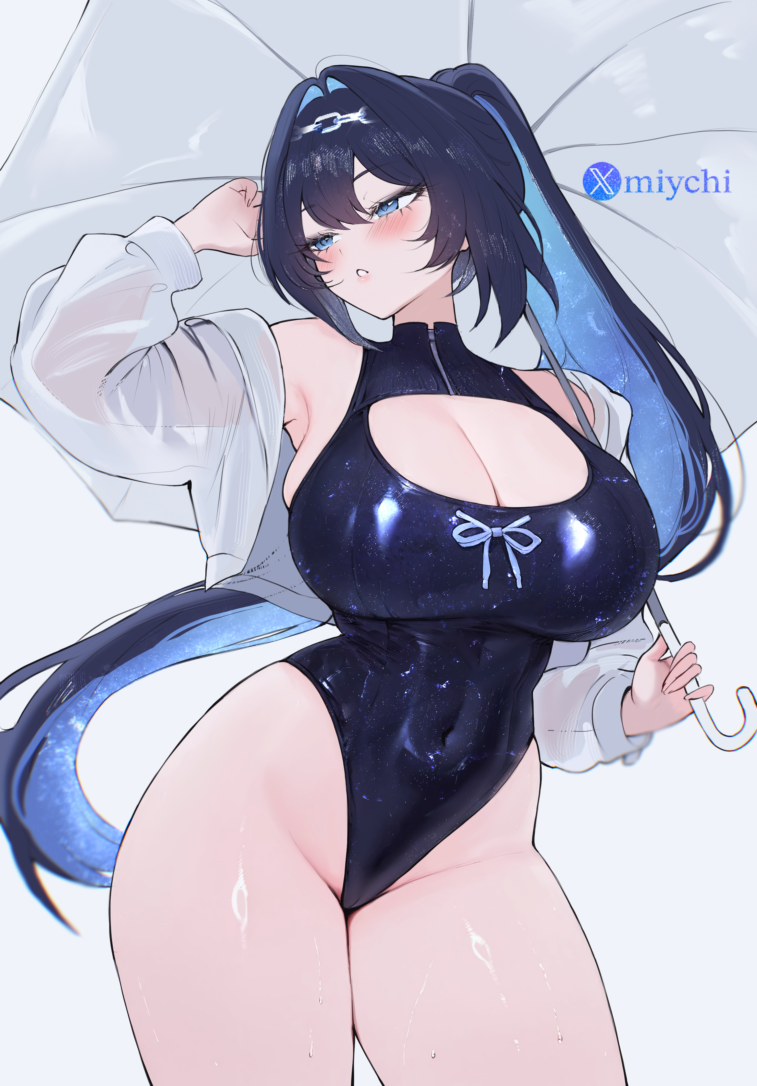 1girlblack hairblack one-piece swimsuitblue eyesblue hairblushbreastscleavagecolored inner haircovered navelcrop tophead chainhigh ponytailholdingholding umbrellajewelrylarge breastslong hairmulticolored hairone-piece swimsuitparted lipsponytailsee-through clothessee-through shirtshirtsoloswimsuittwo-tone hairumbrellavery long hairvirtual youtuberwhite shirt