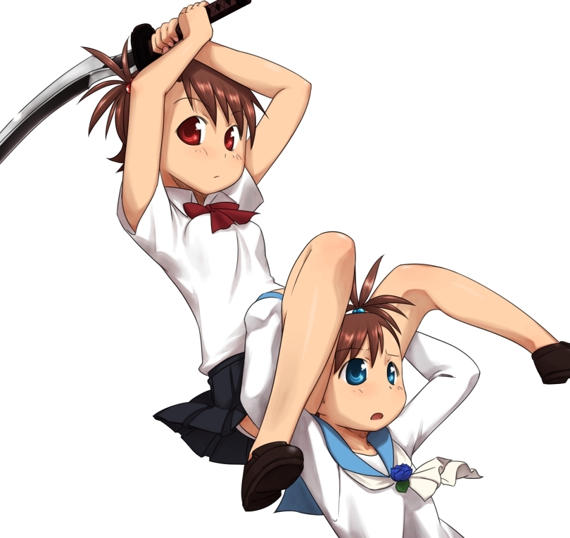 hettaa (kinokosan), hiiragi tsukasa, lucky star, bad id, bad pixiv id, 00s, 1girl, arms behind back, female focus, overalls, purple hair, ribbon, short hair, solo