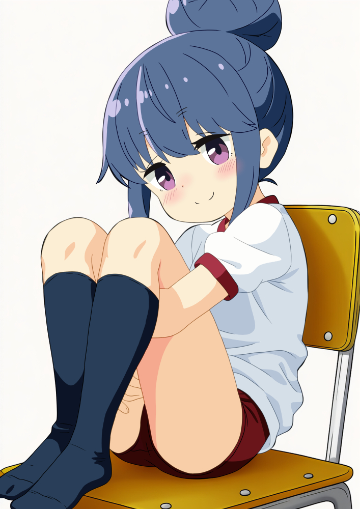 1girlblue hairblushburumachairclosed mouthdot nosefemale focusfull bodygym shirtgym uniformhair between eyeshair bunimpossible clotheslegslooking at viewerno shoespurple eyesred burumashirtshort sleevessittingsmilesockssolot-shirtthighswhite backgroundwhite shirt