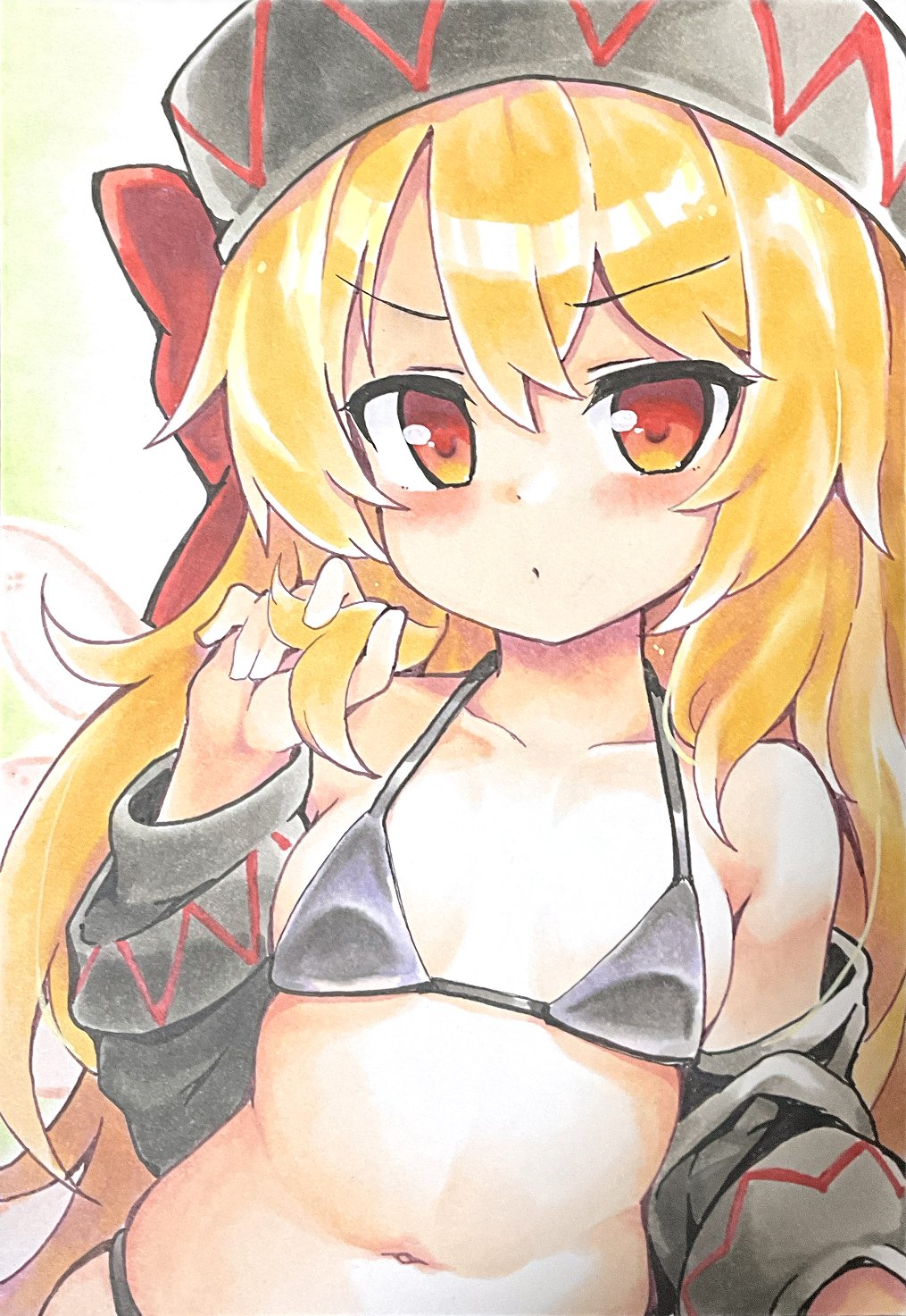 1girlalternate costumebikiniblack bikiniblack hatblack shirtblonde hairblushbreastsclosed mouthcollarbonedot mouthhatholdingholding own hairlong hairlong sleevesnavelred eyesshirtsmall breastssoloswimsuitupper bodyvery long hairwings