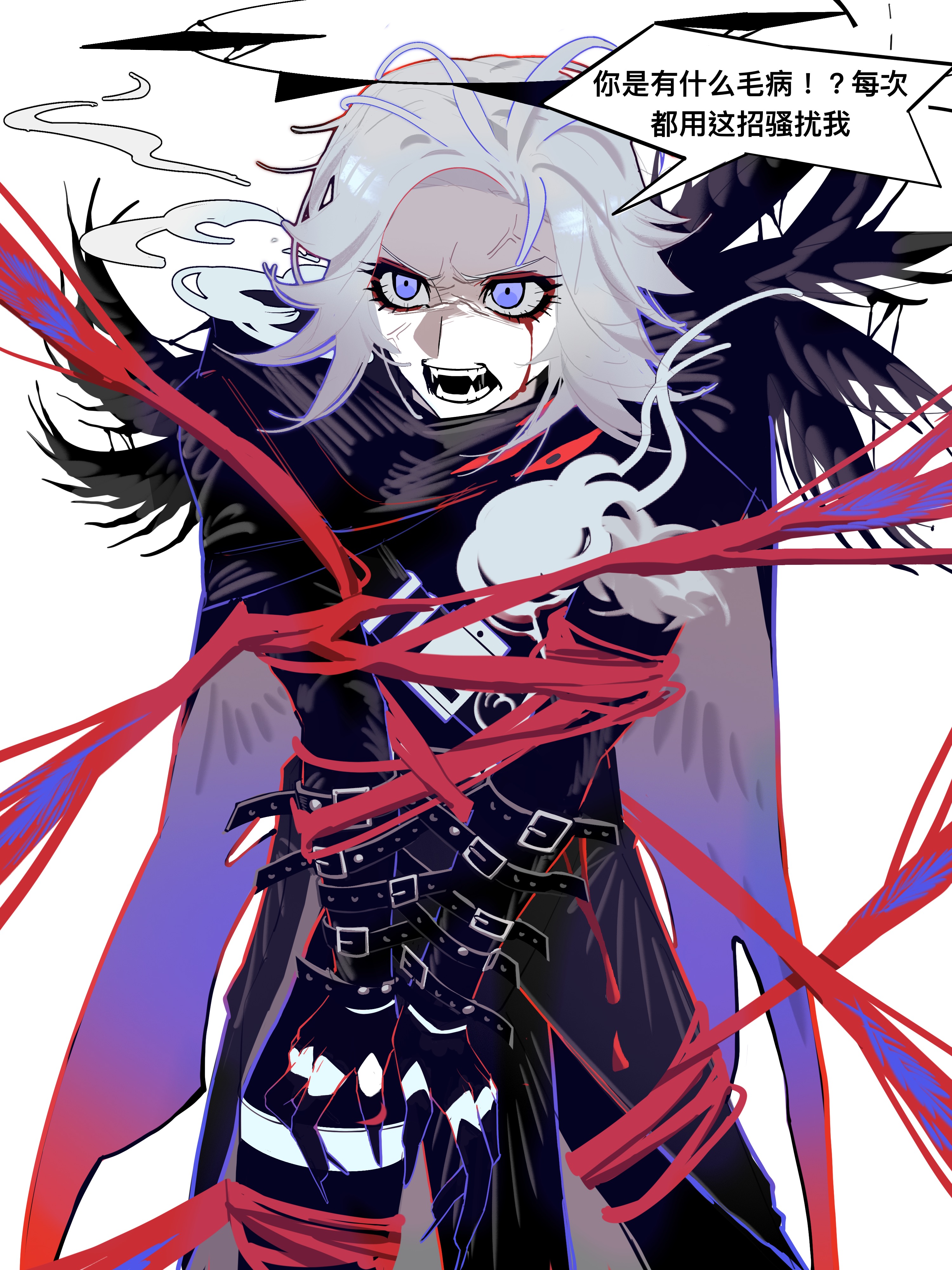 1boyalter servantalternate costumealternate universeanger veinangryblack cloakblack haloblack jacketblack pantsbloodboundbound armsbound legschinese textcloakeyelinerfangsfeathersfingernailsglovesgrey hairhalojacketleather straplooking upmakeupmale focusnapstablook292pantspurple eyesred eyelinersharp fingernailsshort hairsimple backgroundsolowhite background