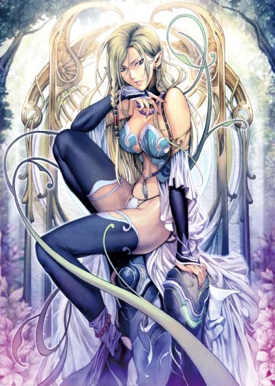 1girlblack thighhighsblonde hairbraidbreastsbridal gauntletscleavageelffemale focuslarge breastslegslipslong hairmidriffpointy earsside braidsittingsolothighhighs