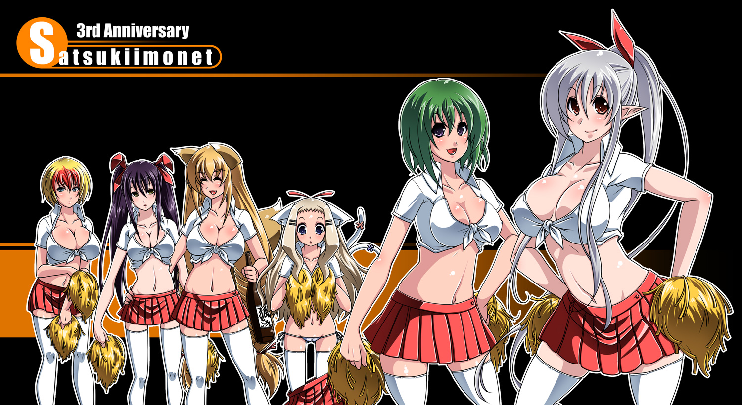 6+girlsalcoholanimal earsblack hairblonde hairbreastscheerleadercleavagefront-tie topgreen hairlarge breastslong hairlowleglowleg pantiesmidriffminiskirtmulticolored hairmultiple girlspantiespointy earspom pom (cheerleading)ponytailsakeshirtshort hairskirttailthigh gapthighhighsthighstied shirttwintailsunderwearwardrobe malfunction