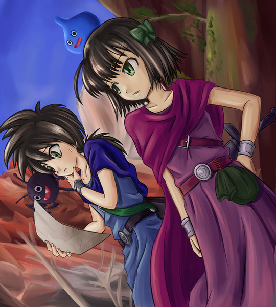 1boy1girlblack hairbowbrother and sistercapegreen eyeshair bowshort hairsiblingsslime (creature)swordweapon