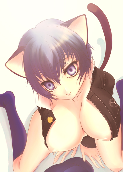 1girlanimal earsblue eyesblue hairbreastscat earscat tailcleavagecrossdressingcrossdressing (ftm)female focushair between eyeshathead tiltjacketkneehighslarge breastsmatching hair/eyesnaked jacketnewsboy capnipplesshort hairsimple backgroundsockssolotailthighswhite background