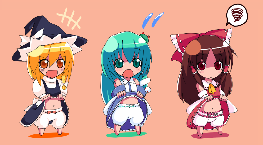 3girlsblonde hairbloomersbowbraidbrown hairchibiclothes liftdetached sleevesfemale focusgreen eyesgreen hairhair ribbonjapanese clotheslong hairmikomultiple girlsred eyesribbonshort hairside braidskirtskirt liftsquiggleunderwearyellow eyes
