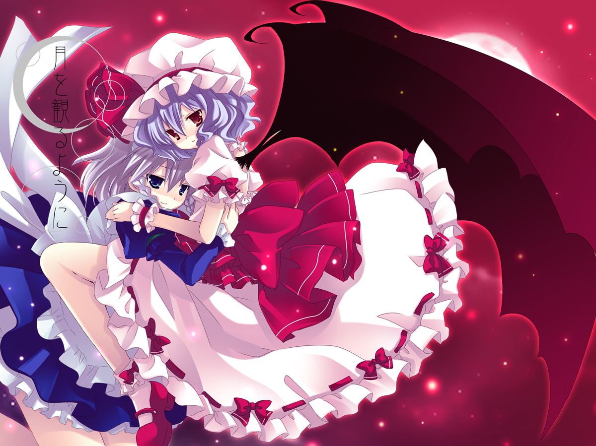 2girlsbat wingsblue eyesblue hairfemale focusgradient backgroundhathugmultiple girlsred eyesshort hairwings