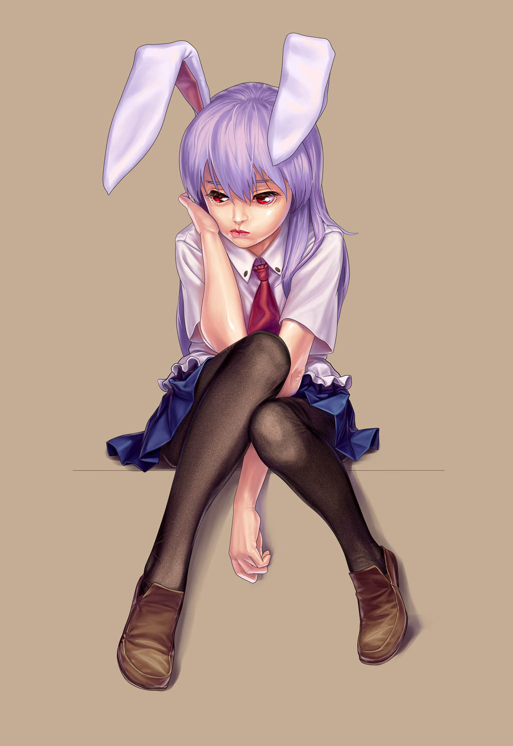 1girlanimal earsfemale focusfull bodynecktiepantyhosepurple hairrabbit earsred eyessittingsolo