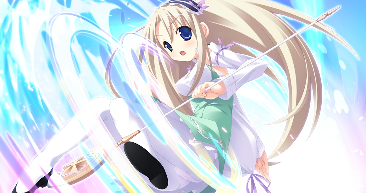 1girlblonde hairdetached sleevesfemale focuslong hairmagical girlpantiespanties under pantyhosepantyhosepantyshotpurple eyessolostaffunderwearwhite pantieswhite pantyhose