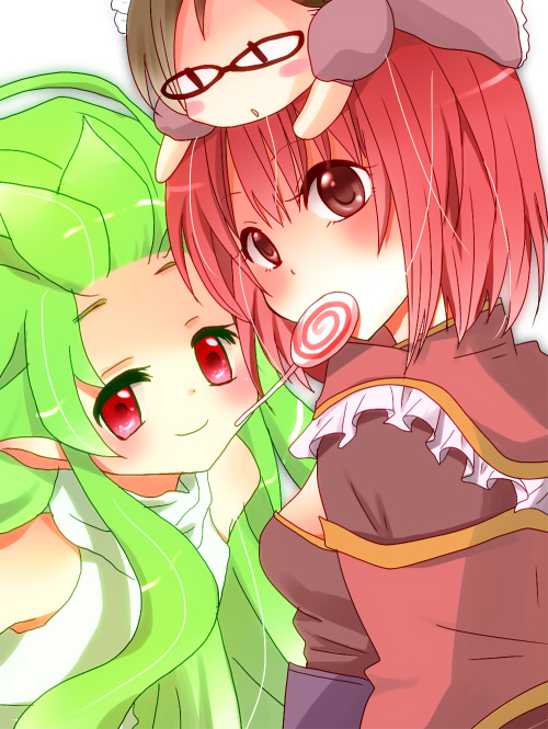 scanty (psg), panty & stocking with garterbelt, highres, 1girl, 7cstrain7, blue hair, breasts, colored skin, demon girl, demon horns, green eyes, green hair, gun, horns, large breasts, long hair, looking at viewer, red skin, solo, weapon