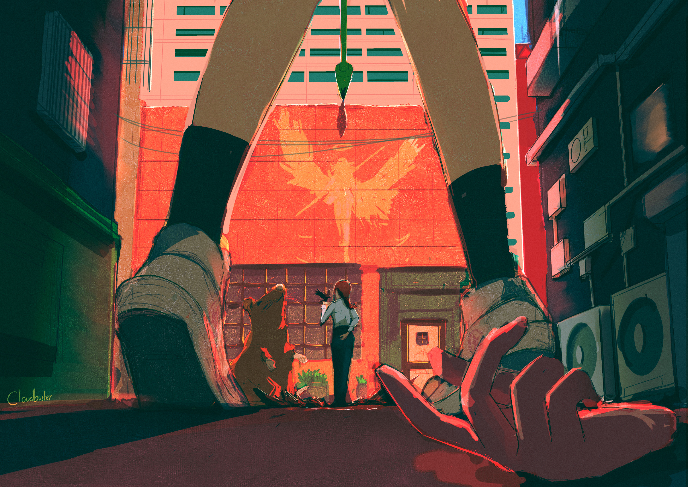 2girlsanimalbirdblack pantsblack socksbraidbraided ponytailbuildingcitycloudbuster 104condenser unitcrowdoorimplied injurylong hairmouse (animal)multiple girlsoutdoorsoversized animalpantspolearmred hairsevered handshirtsocksspearweaponwhite shirtwindow