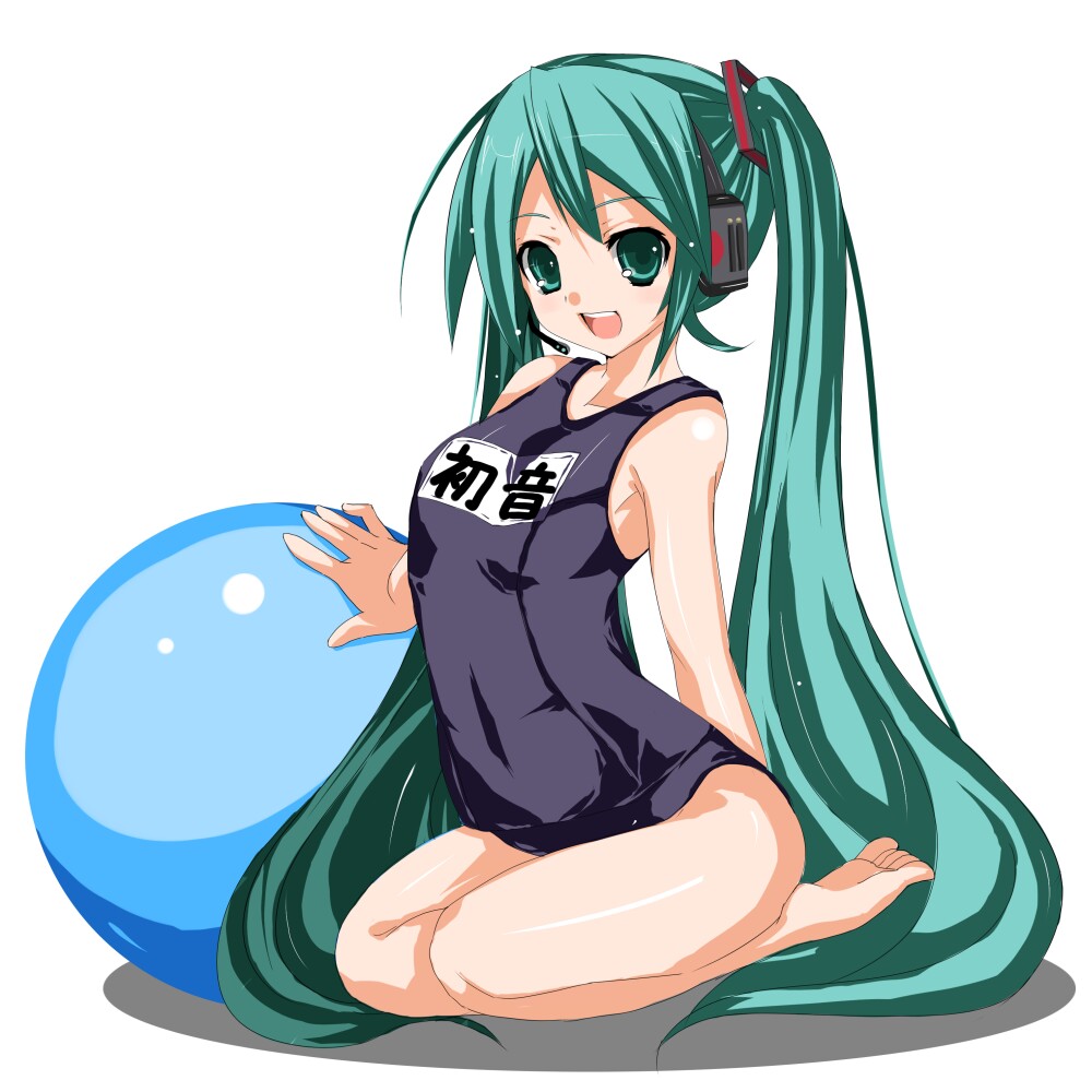 ballbarefootbeachballgreen eyesgreen hairkneelinglong hairone-piece swimsuitopen mouthschool swimsuitsoloswimsuittwintails