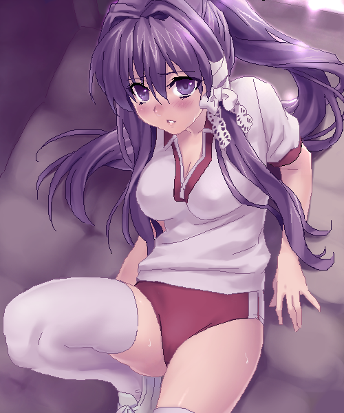 shinama, suzumiya haruhi, suzumiya haruhi no yuuutsu, 00s, 1girl, armband, black socks, brown eyes, brown hair, cameltoe, female focus, hairband, kneehighs, muahahaa, panties, pantyshot, school uniform, serafuku, short hair, socks, solo, underwear, white panties
