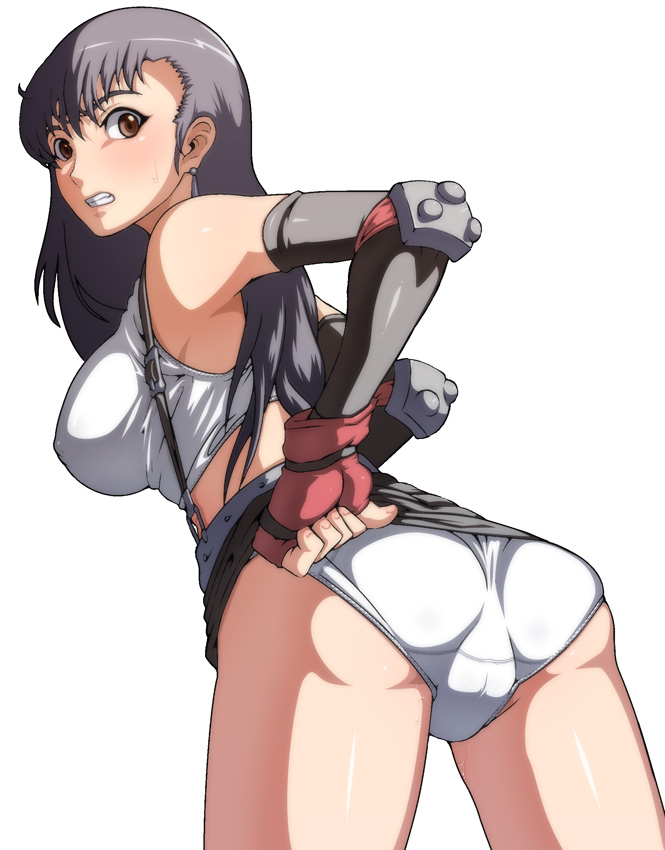1990s (style)1girlassblack hairbrown eyescameltoeclothes liftfemale focusfingerless glovesgloveslong hairlooking backmidriffpantiespantyshotpencil skirtretro artstyleskirtskirt liftsolosuspender skirtsuspendersunderwear