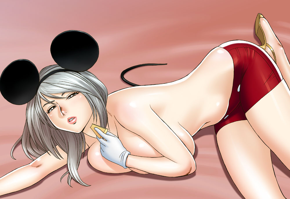 1girlanimal earsbike shortsbreastscheesecosplayfemale focusfoodhigh heelshuge breastslyingmickey mouse (cosplay)mouse (animal)mouse earssandalsshoessolo