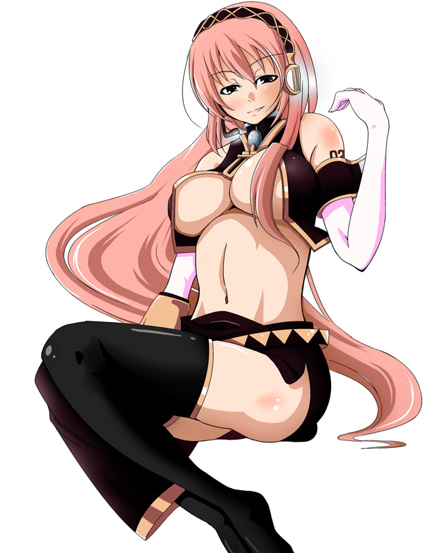 1girlarmletassasymmetrical clothesblack thighhighsblushbreastsdetached sleevesfemale focusheadsetjewelrylarge breastslong hairmidriffnavelpink hairside slitsimple backgroundsittingskirtsolothighhighsunderboobvery long hair