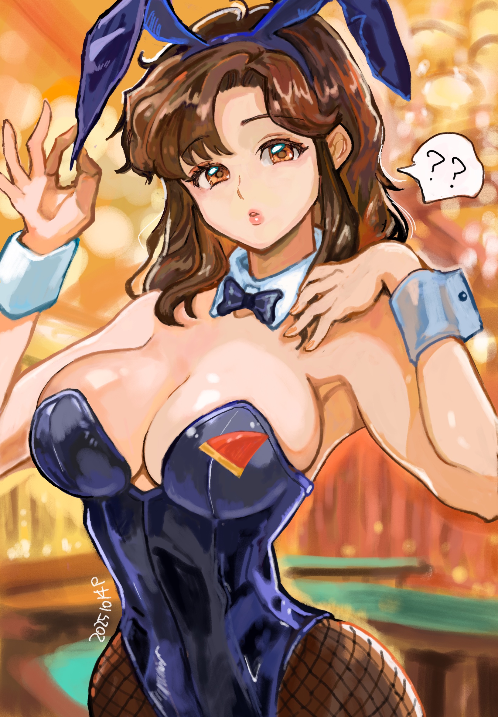 1boy1girlanimal earsblack leotardbowbowtiebreastsbrown eyesbrown hairdateddetached collarfake animal earsfishnet pantyhosefishnetshighleghighleg leotardlarge breastsleotardlong hairlooking at viewerpantyhoseplayboy bunnyrabbit earsspeech bubblespoken question markstraplessstrapless leotardwhite wrist cuffswrist cuffs