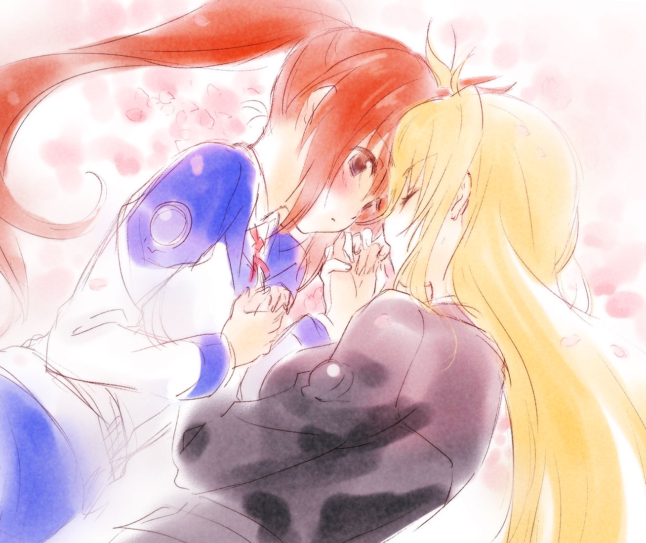 00s2girlsblonde hairblue eyesbrown hairhair ribbonlong hairmilitarymilitary uniformmultiple girlsred eyesribbonside ponytailyuri