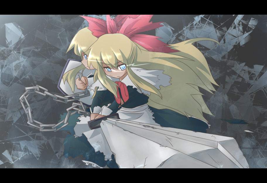 2girlsblonde hairblue eyeschaindolleye trailfemale focusfighting stanceforeshorteninghair ribbonletterboxedlight trailmultiple girlsribbonshieldswordtorn clothesweapon