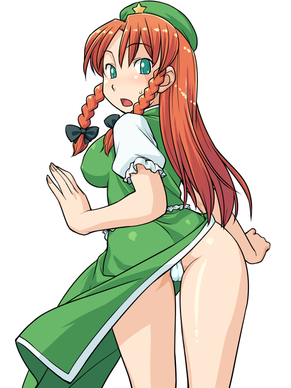 1girlassbraidbreastscameltoecovered erect nipplesfemale focusgreen eyeshatlarge breastslong hairpantiespantyshotred hairsolotwin braidsunderwearwhite pantieswindwind lift