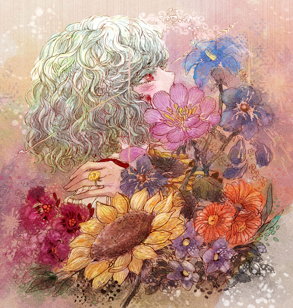 fuju, frederic chopin (trusty bell), trusty bell, 1boy, backlighting, bouquet, elbow gloves, expressionless, feathers, flower, formal clothes, frilled sleeves, frills, gears, gloves, hand on own chest, hat, hat feather, long sleeves, looking up, male focus, parted lips, purple eyes, purple hair, purple hat, solo, suit, top hat, upper body