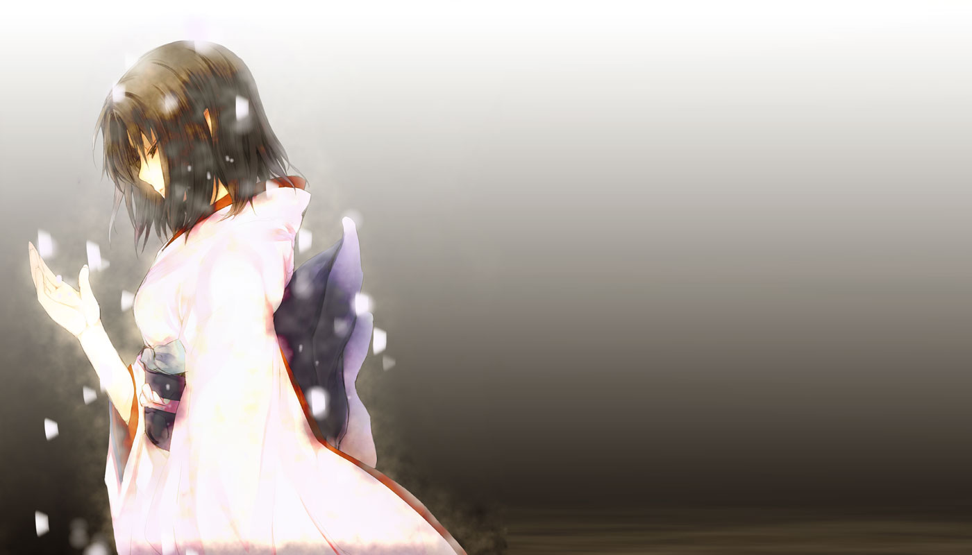 1girlbowbrown eyesbrown hairclosed mouthexpressionlessfemale focusfrom sideglowinggradient backgroundhalf-closed eyesjapanese clotheskimonolong sleevesprofilepurple bowshort hairsoloupper bodywhite kimonowide sleeves
