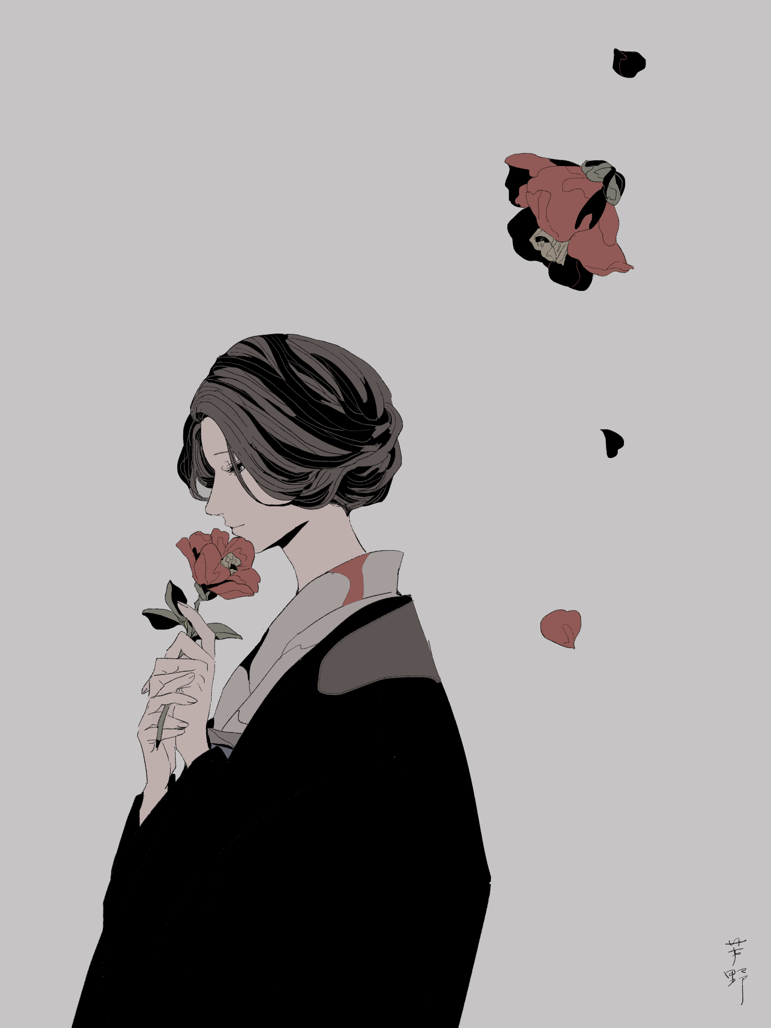1girlblack hairblack kimonoclosed mouthexpressionlessflowergrey backgroundhair bunhands upholdingholding flowerjapanese clotheskimonolong sleevesmuted colornegative spacered flowersimple backgroundsingle hair bunsolostandingupper body