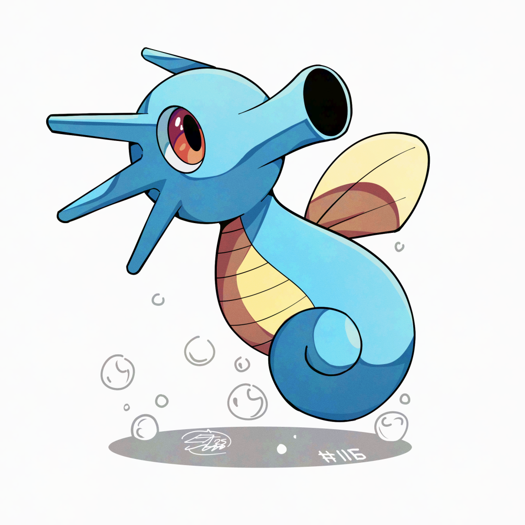 blue skincolored skinfishfull bodygen 1 pokemonno humansnumberedpokemon (creature)red eyesseahorsesignaturesimple backgroundsolospeech bubblewhite background