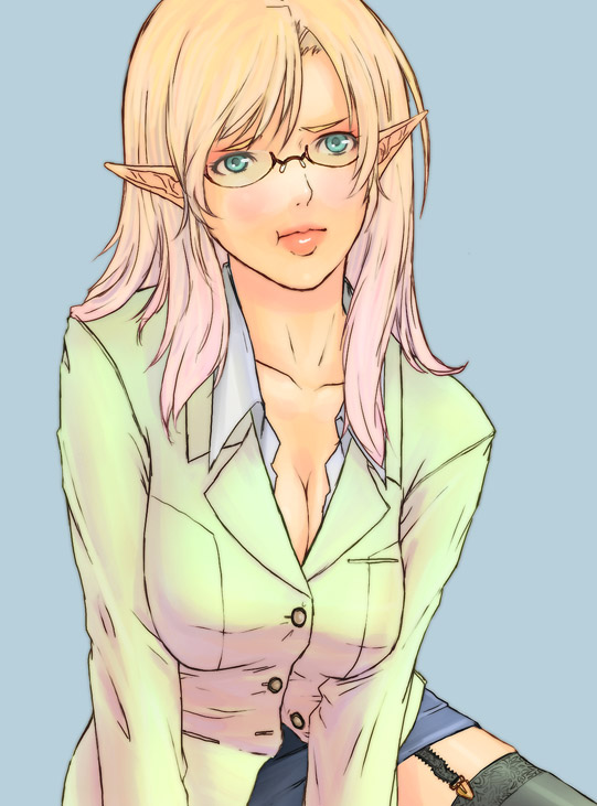 1girlblazerblonde hairbreastscleavagefemale focusglassesgreen eyesjacketlarge breastspointy earssolothighhighs