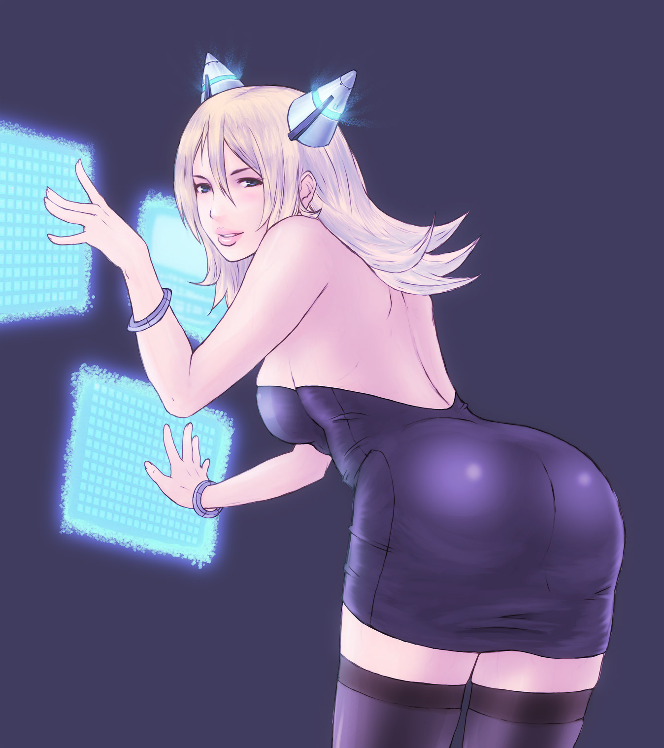1girlassbackless dressbackless outfitbent overblonde hairblue eyesbraceletdressfemale focusfrom behindjewelrylipslooking at viewerlooking backskindentationsmilesolostandingthighhighs