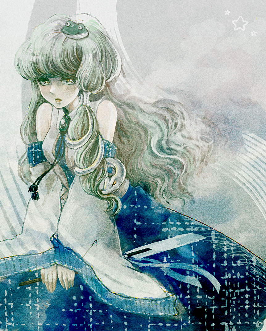 1girldetached sleevesfaux traditional mediafemale focusfroggoheigreen hairjapanese clothesmikooonusasnakesoloyellow eyes