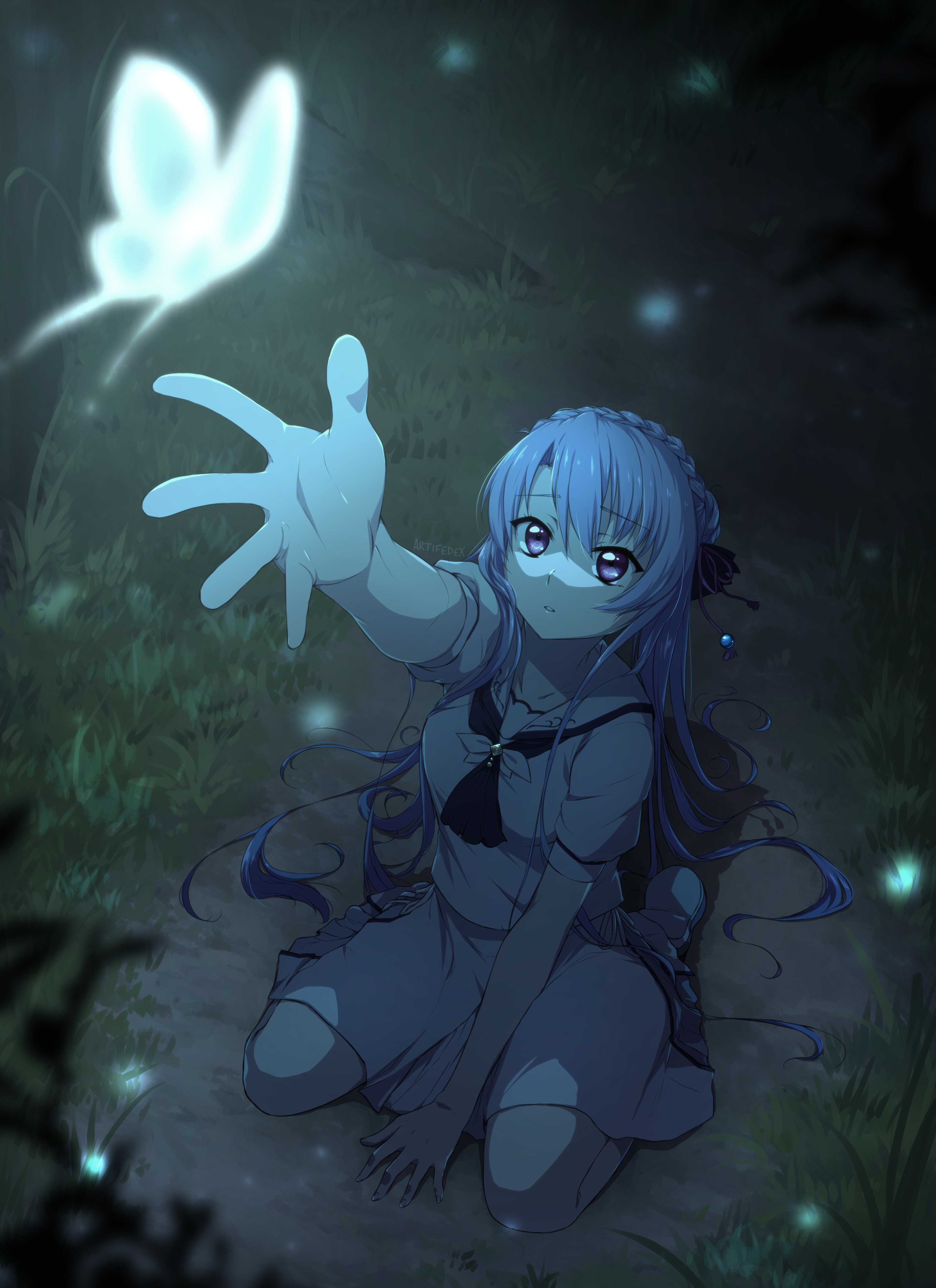 maehara shinobu, love hina, blue eyes, blue hair, bob cut, clog sandals, shirt, short hair, solo, striped clothes, striped shirt