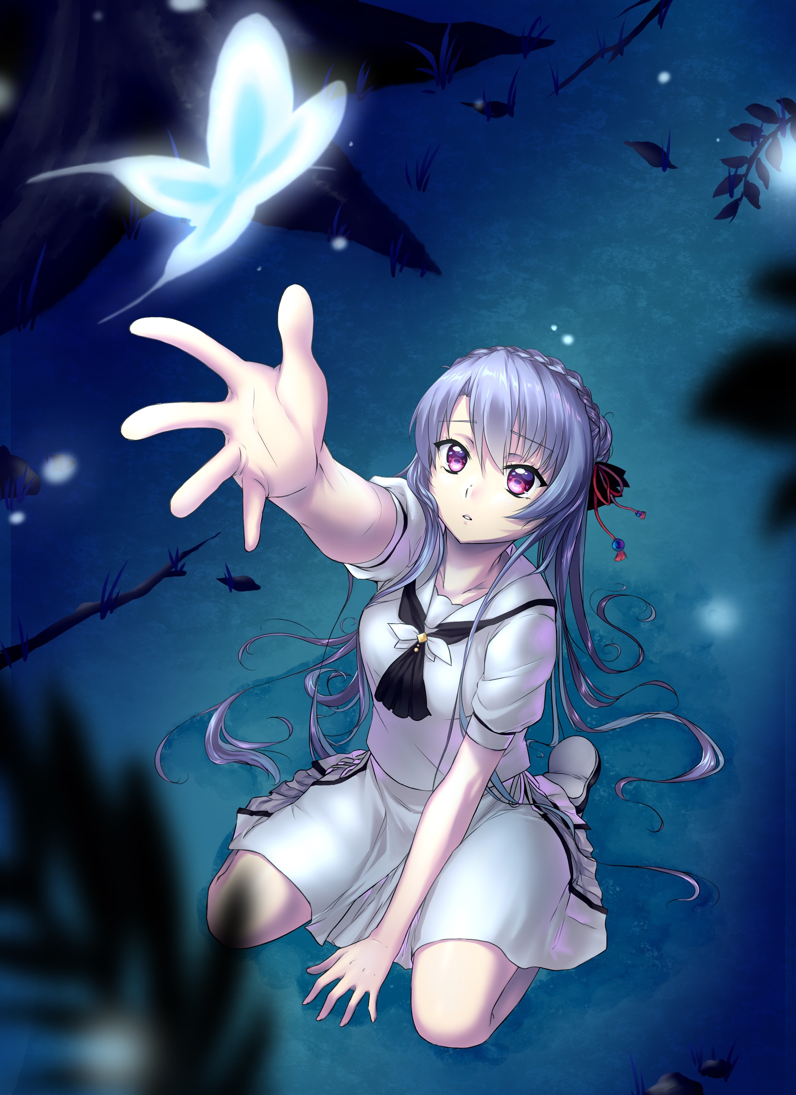 snow20200, lumine (genshin impact), scaramouche (genshin impact), genshin impact, 1boy, 1girl, arm cutout, black bodysuit, black kimono, black sandals, black shorts, black sleeves, blonde hair, bloomers, blue flower, blue trim, blunt ends, blush, bodysuit, breasts, bridal legwear, chibi, closed mouth, clothing cutout, detached sleeves, dress, eyeliner, eyeshadow, feather hair ornament, feathers, fireworks, flower, furisode, gold shoes, gold trim, grey nails, hair flower, hair intakes, hair ornament, holding, holding fireworks, hugging own legs, japanese clothes, juban, kimono, knees up, layered sleeves, looking at another, makeup, mandarin collar, mitsudomoe (shape), multicolored flower, night, on grass, open clothes, open kimono, outdoors, purple eyes, purple hair, purple sleeves, red eyeliner, red eyeshadow, red kimono, red sash, sandals, sash, scarf, shoes, shooting star, short hair, short hair with long locks, short sleeves, shorts, side-by-side, sideboob, sidelocks, sitting, smile, sparkler, star (sky), starry sky background, stirrup legwear, tareme, tassel, tearing up, tears, thighhighs, toeless legwear, toenails, toes, tomoe (symbol), tsurime, twitter username, underwear, vambraces, watermark, white bloomers, white dress, white feathers, white flower, white kimono, white scarf, white sleeves, white thighhighs, wispy bangs, yellow eyes, zouri