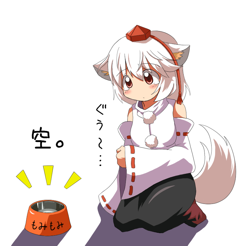 1girlanimal earsbowldetached sleevesfemale focushathungrykneelingpet bowlred eyessittingsolostomach growlingtailtearstokin hatwhite hairwolf earswolf tail