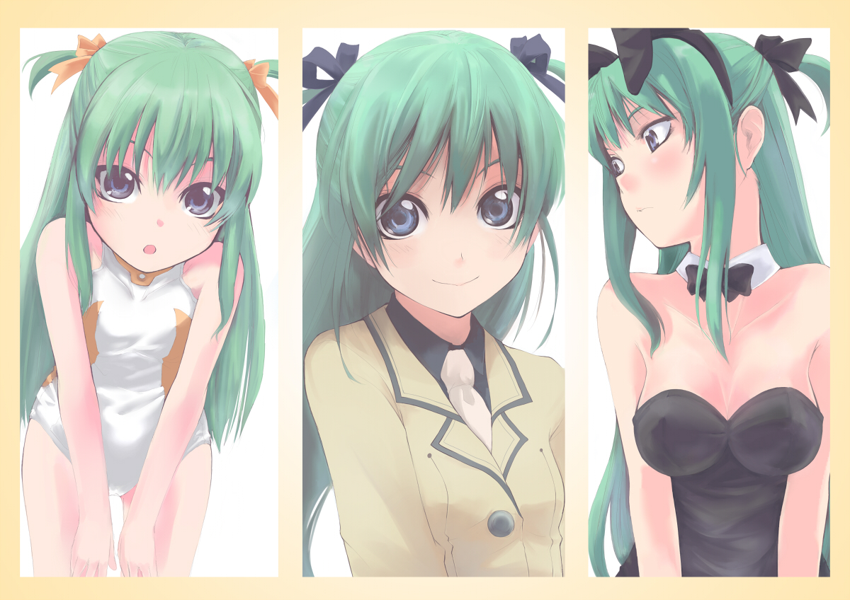 :o00s1girlanimal earsblue eyesfake animal earsgreen hairlong hairnecktieone-piece swimsuitplayboy bunnyrabbit earsribbonschool uniformswimsuit