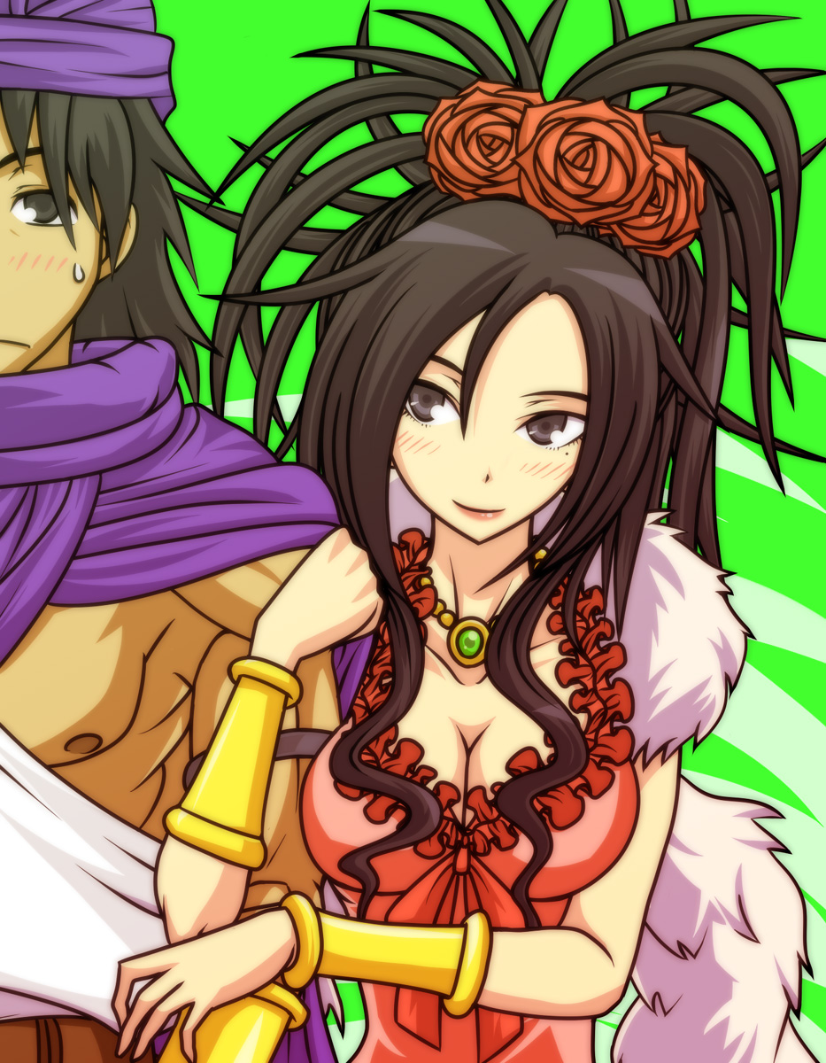 1boy1girlblack eyesblack hairbracerbreastscleavagecoupleflowerhair flowerhair ornamentheteroholding another's armlarge breastsmolemole under eyenipplesrose