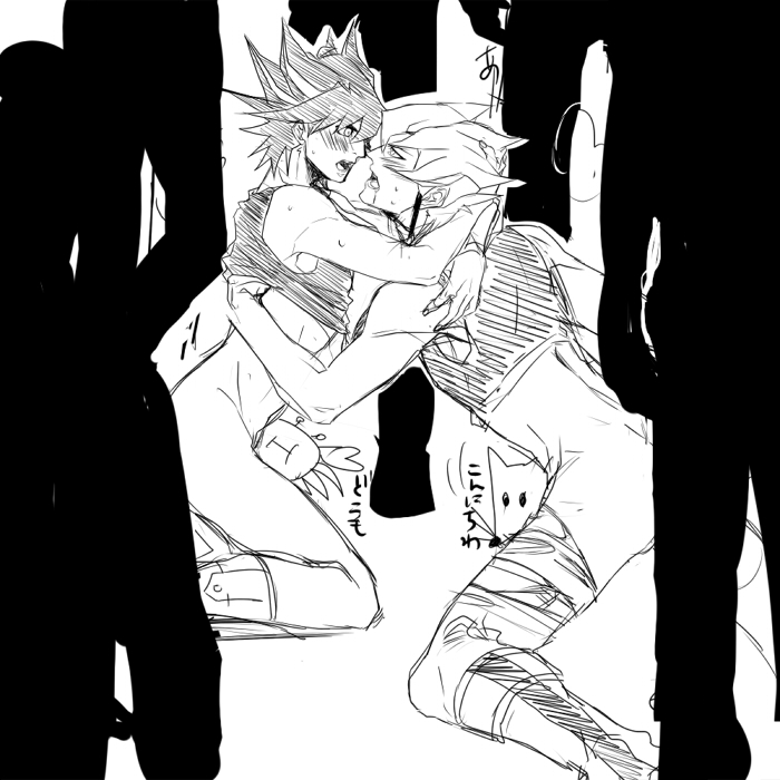 hero (dq6), dragon quest, dragon quest vi, 1boy, armlet, belt buckle, buckle, choker, clenched hand, earrings, fingerless gloves, from below, gloves, gvdygdu, hoop earrings, jewelry, looking to the side, male focus, monochrome, robe, short hair, shorts, single bang, smirk, solo, spiked hair, sword, sword on back, toriyama akira (style), weapon, weapon on back