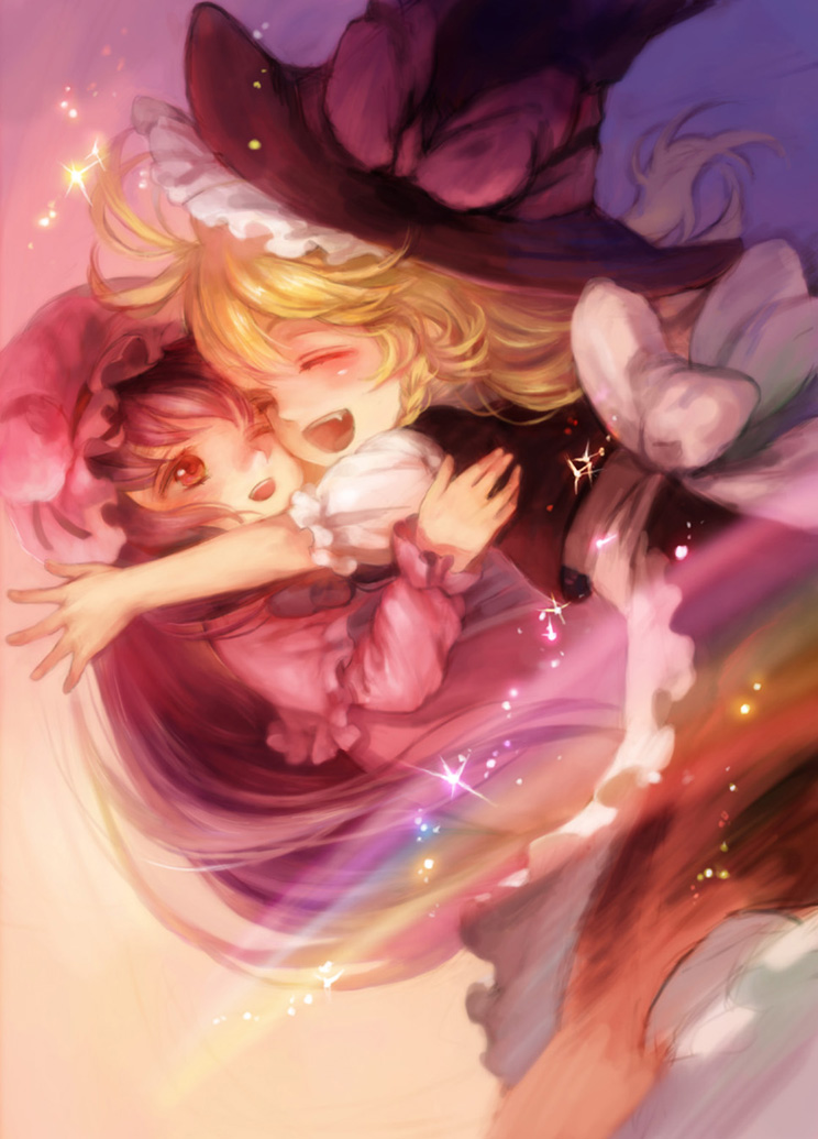 2girlsblonde hairclosed eyesfemale focushappyhathugmultiple girlsone eye closedopen mouthsmileyuri