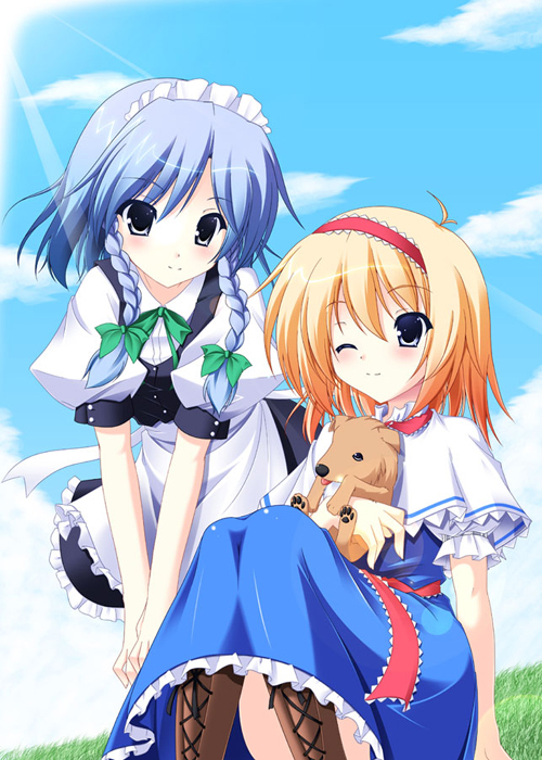 yaha0079, shampoo (ranma 1/2), ranma 1/2, absurdres, highres, 1girl, apron, bell, bikini, bow, double bun, green apron, hair bell, hair bow, hair bun, hair ornament, long hair, maid apron, purple background, purple hair, red bikini, red eyes, sidelocks, simple background, smile, swimsuit, yellow bow