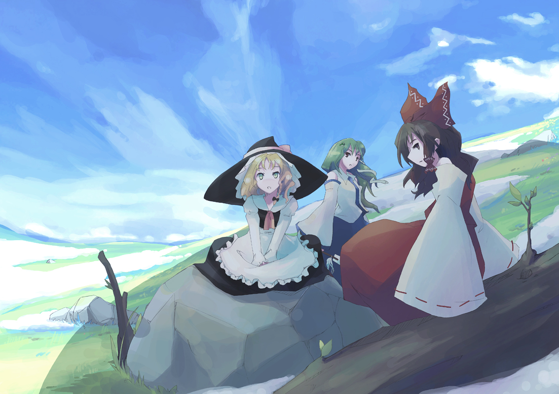 8bit, hachi (8bit canvas), suran8, cirno, hakurei reimu, kirisame marisa, embodiment of scarlet devil, touhou, absurdres, bad id, bad pixiv id, highres, translation request, 3girls, blonde hair, bloomers, blue hair, comic, female focus, food, japanese clothes, long hair, miko, multiple girls, ribbon, short hair, underwear, wings