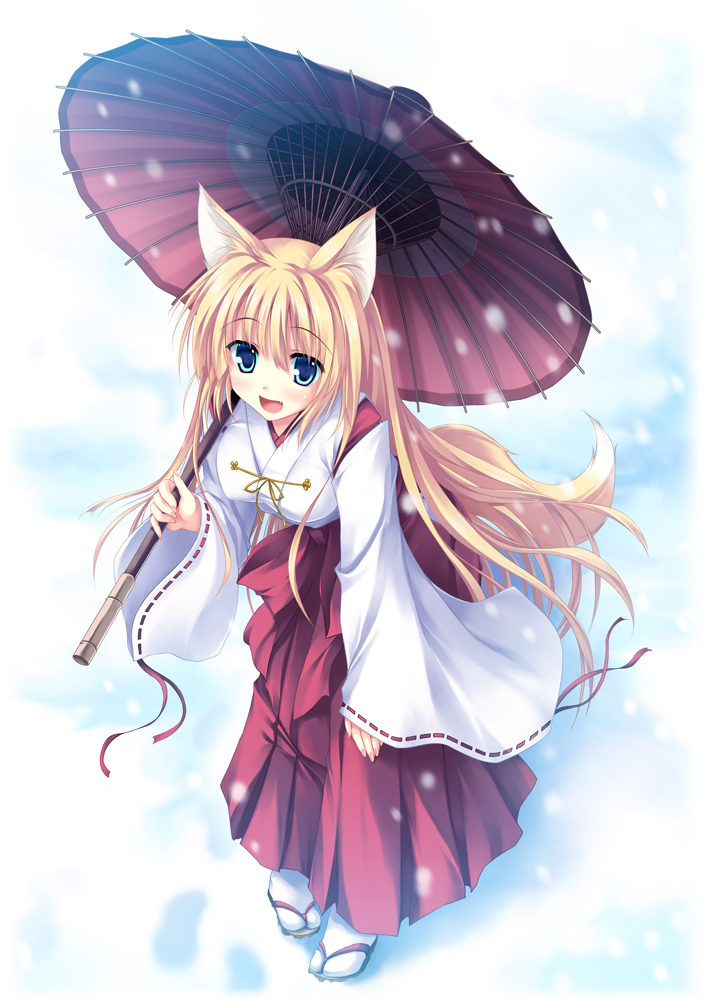 :d1girlanimal earsblonde hairblue eyesfangfemale focusfox earsjapanese clotheslong hairmikooil-paper umbrellaopen mouthsmilesnowsolotailumbrellavery long hair