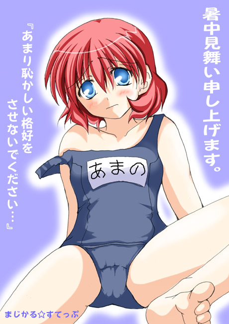 1girlbarefootblue eyesfeetfemale focusname tagone-piece swimsuitorange hairschool swimsuitshochuumimaishort hairsolospread legsstrap slipswimsuit