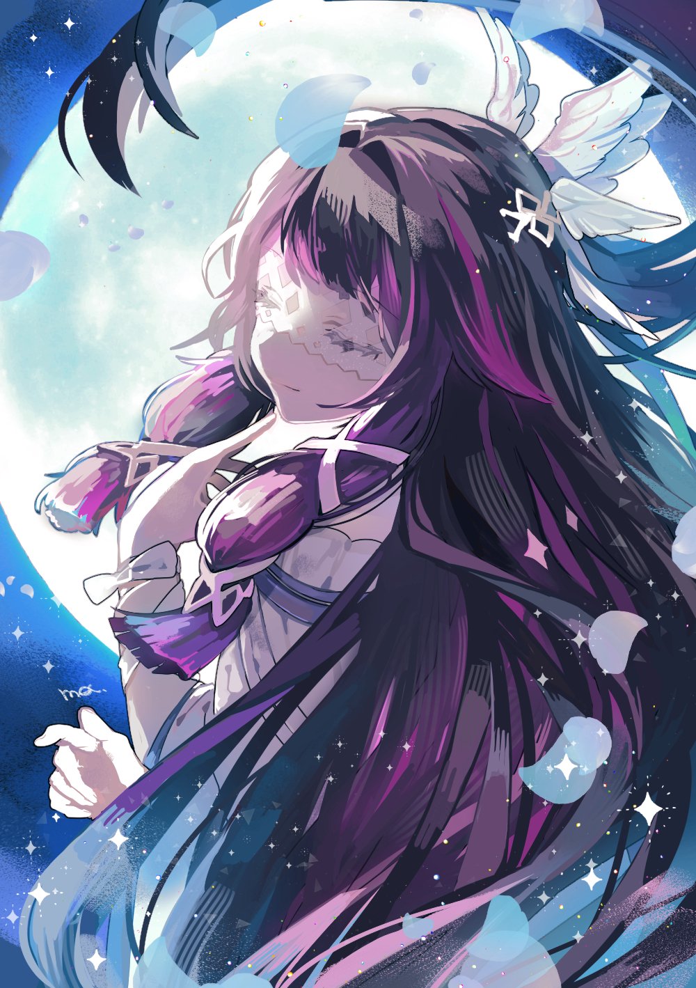 1girlangel wingsbare shouldersblack hairblue skybowclosed eyesclosed mouthdaydresseye maskfeathered wingsfloating hairfull moongradient hairhair ornamenthand uphead wingsmaskmoonmulticolored hairnightnight skyoff shoulderoff-shoulder dressoutdoorspetalspuffy short sleevespuffy sleevespurple hairshort sleevessidelocksskysmilesolosparklewhite bowwhite dresswhite maskwingsx hair ornament