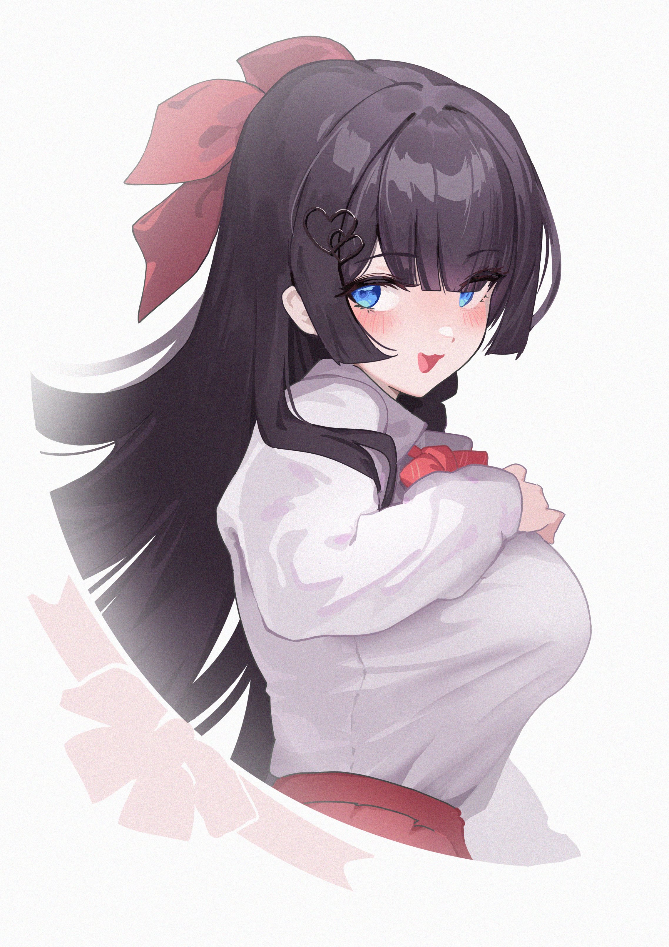 1girlblack hairblue eyesblunt sidelocksblushbowbowtiebreastscropped torsofilm grainfrom sidehair bowhair ornamenthand on own chestheartheart hair ornamentlarge breastslong hairlong sleeveslooking at viewerlooking to the sideopen mouthred bowred bowtieshirtshirt tucked insidelockssimple backgroundsmilesolostraight hairtented shirtvirtual youtuberwhite backgroundwhite shirt