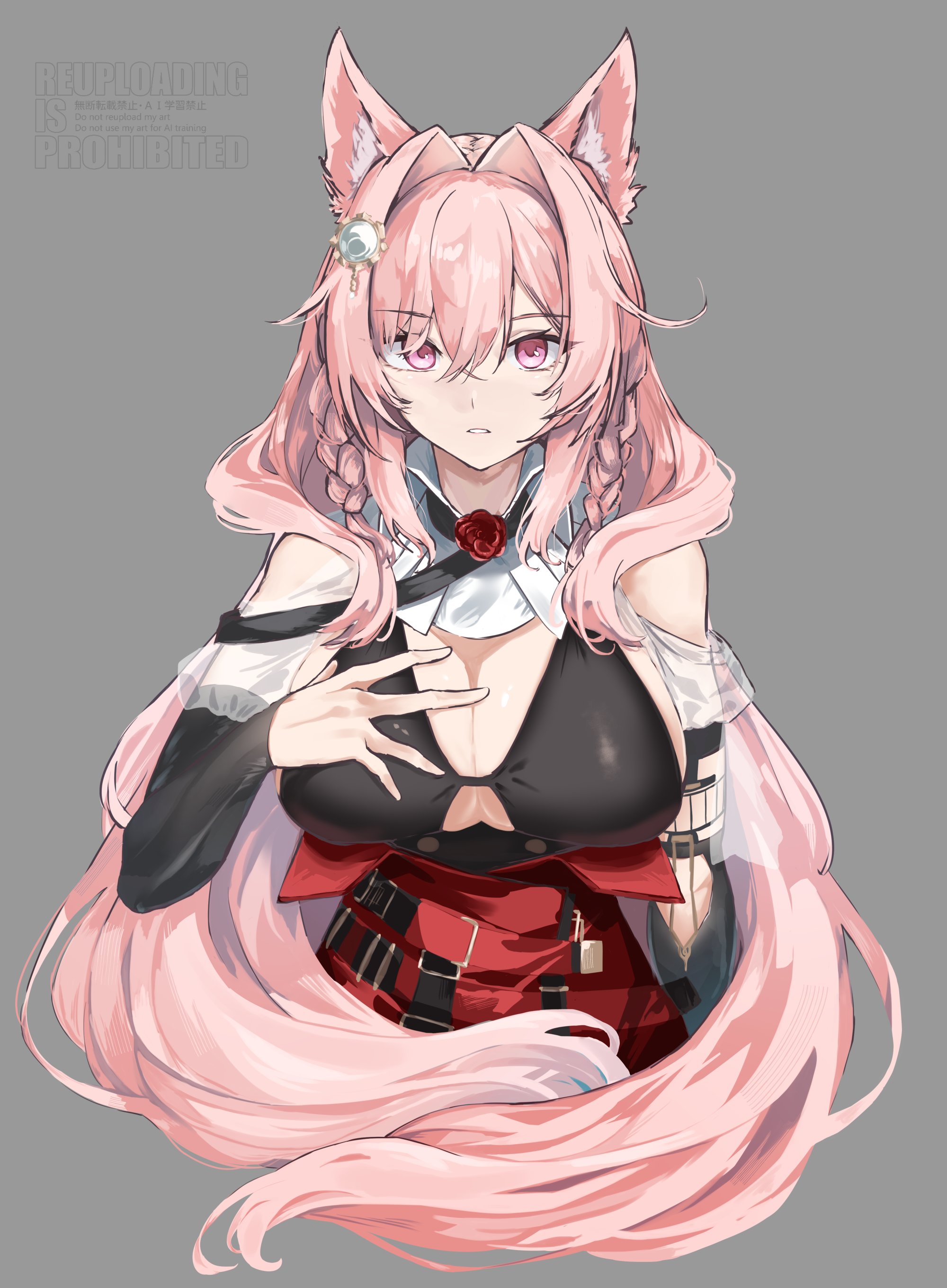 1girlanimal ear fluffanimal earsbare shouldersblack sleevesbraidbreast suppressbreastscleavagecropped torsocrossed bangsdetached sleevesflowergrey backgroundhair between eyeshair intakeshair ornamentlarge breastslong hairlong sleeveslooking at viewerparted lipspink eyespink hairred flowerred roserosesee-through clothessimple backgroundsolowatermark