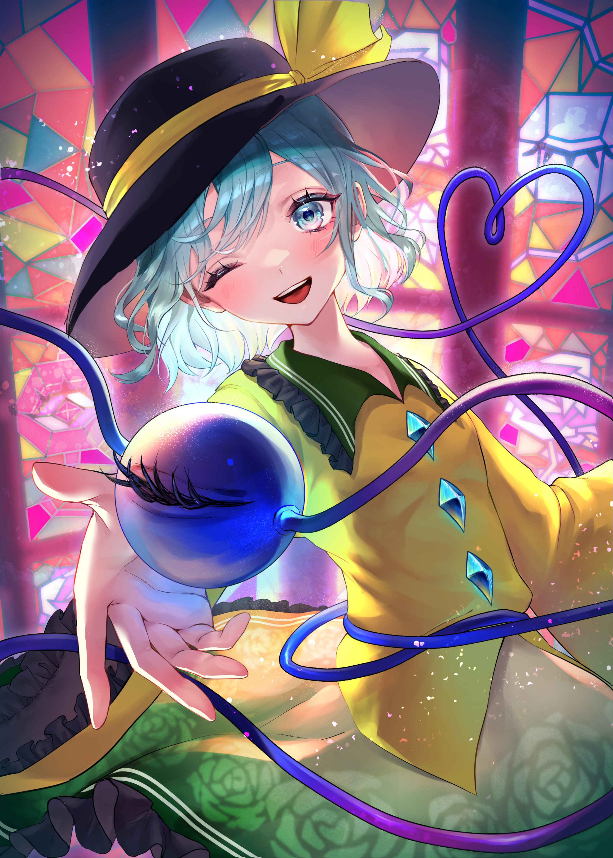 1girlblack hatblushbowfrillsgreen eyesgreen hairgreen skirthathat ribbonheartheart of stringlong sleeveslooking at viewerone eye closedopen mouthribbonshirtshort hairskirtsmilesolothird eyewide sleevesyellow shirt