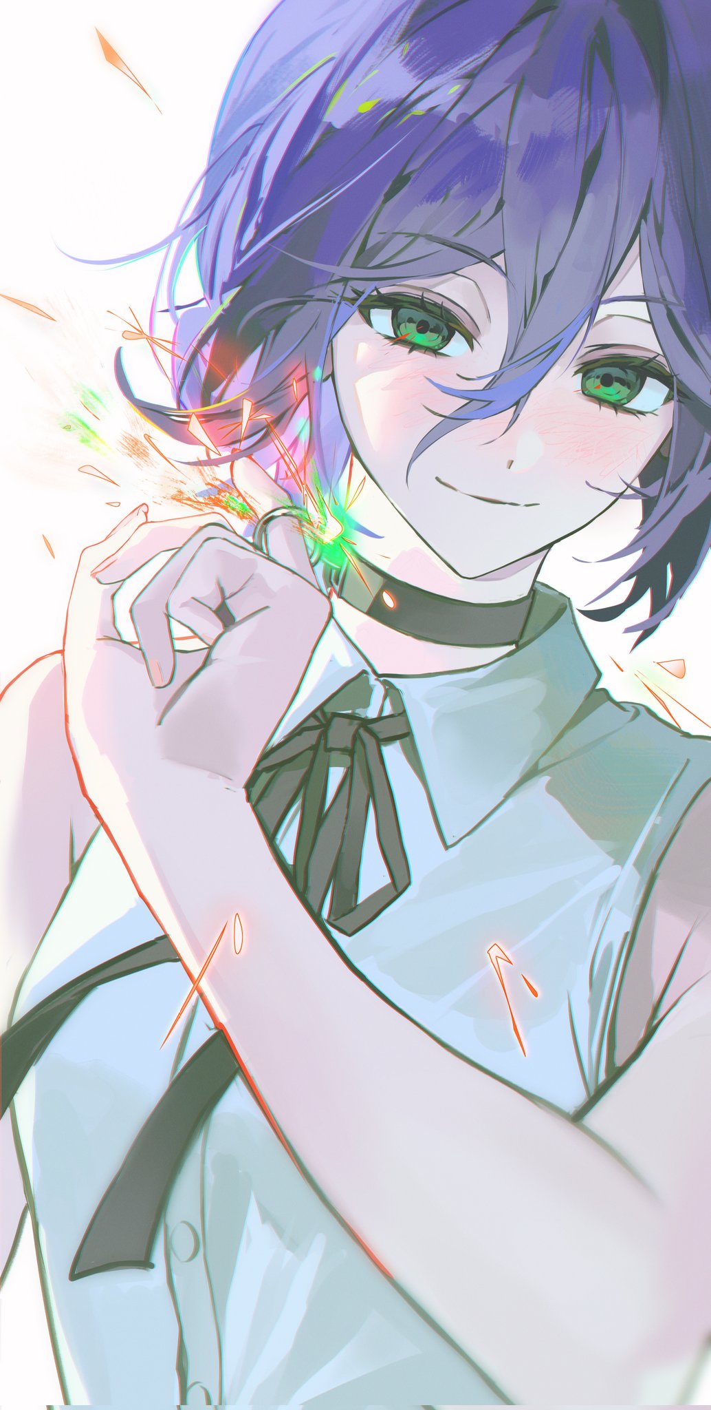 1girlbaegi201bare armsbare shouldersblack chokerblack ribbonchokerclosed mouthcollared shirtgreen eyesgrenade pinhair between eyeshand uplooking at viewerneck ribbonpurple hairribbonshirtshort hairsleevelesssleeveless shirtsmilesolosparksupper bodywhite backgroundwhite shirt