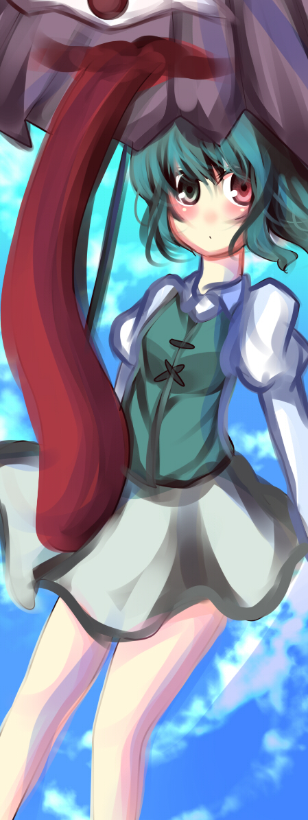 1girlblue hairfemale focusgreen eyesheterochromiakarakasa obakeoil-paper umbrellared eyessolotongueumbrella