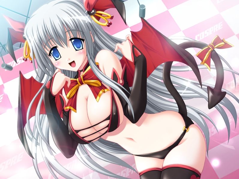 1girlbat wingsblue eyesblushbreastscleavagedemon girldemon tailelbow glovesfemale focusgloveslarge breastsopen mouthpantiesribbonsmilesolotailthighhighsunderwearwhite hairwings